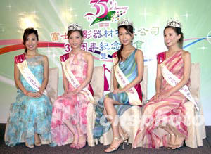 應屆出爐港姐冠軍曹敏莉(右二)、亞軍楊洛婷(右一)、季軍戚黛黛(左二)、最上鏡小姐及卓越才藝小姐兩個獎項的李詩韻(左一)8月29日在香港出席贊助商富士攝影器材有限公司頒贈獎品儀式。中新社記者:鄧慶樂