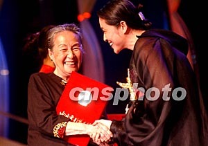 中國電影第九屆華表獎三十日晚在北京北展劇場揭曉,在《世界上最疼我的那個人去了》中飾演主角的黃素影與在《美麗的大腳》中飾演主角的倪萍榮獲優秀女演員獎。中新社記者:武仲林