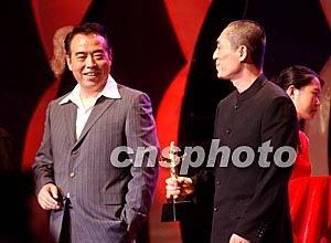 中國電影第九屆華表獎三十日晚在北京北展劇場揭曉,張藝謀導演的《英雄》獲特殊貢獻獎與優秀對外合拍片兩項大獎。圖為陳凱歌為張藝謀頒發特殊貢獻獎。中新社記者:武仲林