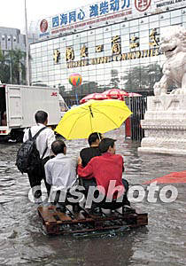 “杜鵑”臺風給廣州帶來了狂風暴雨,不少地方出現水淹現象,三日,廣州外貿中心正舉辦一個大型展覽,賓客們只好利用臨時拼造的“小舟”進館。作者:梁永強