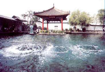 趵突泉北岸有一組較大的古建筑群,通稱三大殿。最南大殿“濼源堂”,三間兩層,歇山飛檐,古色古香,建于北宋年間,挹廈柱上,刻著元代文學家趙孟兆頁的著名詩句:“云霧潤蒸華不住,波濤聲震大明湖。”字體雄渾有力,詩句生動傳神,恰與眼前的波光水影交相輝映。殿堂后面還有兩座大殿,原寫“娥姜祠”,現寫“娥英祠”,后人為贊頌舜的兩位妃子娥皇、女英而建祠,以志紀念。在三大殿院內的花格透墻上,鑲嵌著30余方石刻,都是歷代名人的佳作詩篇。特別值得一提的是院內的那尊罕見的“雙御碑”,記載著康熙三臨、乾隆二臨趵突泉的題詞詩文,標示著趵突泉的地位。