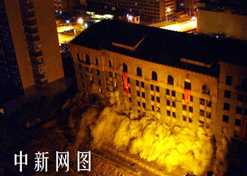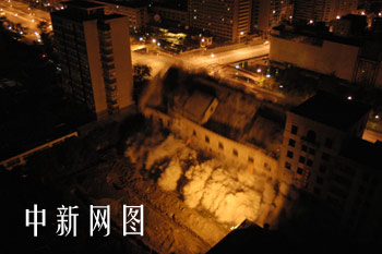 爆破中的中華全國總工會大樓。中新社記者 鄒憲攝