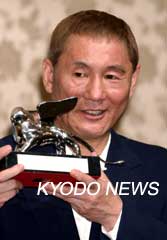 中新網9月10日電 在第60屆威尼斯國際電影節上以古裝片《座頭市》榮獲最佳導演獎的日本導演北野武(Kitano Takeshi)8日在東京舉行記者招待會,從當天回國的北野事務所的森昌行社長手里接過銀獅獎杯。