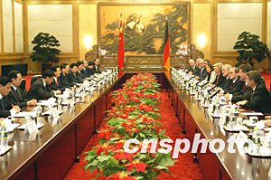 胡錦濤說,中德兩國人民有著長期友好交往的歷史,建交三十多年來,尤其是中國實行改革開放、德國重新實現(xiàn)統(tǒng)一后,兩國關(guān)系全面發(fā)展。兩國高層交往密切,雙方經(jīng)貿(mào)合作不斷擴(kuò)大。我們贊賞德國歷屆政府堅持一個中國政策,保持對華政策的連續(xù)性,致力于中德友好。