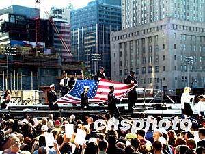 八點三十分,紀念儀式正式開始,完全不同于去年滿臺政要的場面,紐約市長布隆博格、紐約州長柏塔基以及前市長朱利安尼都只分別穿插著作了簡短的講話,其余的三個多小時全部由來自罹難者家庭的約二百名孩子輪流誦讀兩千七百九十二名罹難者名單,很多罹難者家屬在聽到親人的名字時高高舉起手中的照片。整個誦讀曾四次中斷,全場以默哀方式紀念兩座大樓被撞和倒塌的四個悲劇性時刻。
