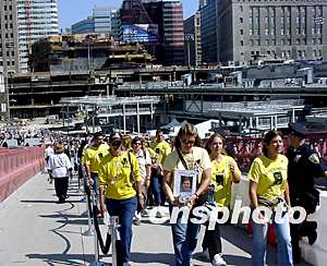 十一日清晨,位于紐約曼哈頓下城的世貿廢墟聚集了大批的罹難者家屬。一位母親在人群中高舉著女兒的照片,像是在接迷路的孩子回家。兩年以來他們只有在每年的這一天才能來到這里,和逝去的親人離得近些。