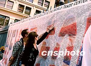 美東時間九月十一日,數(shù)以千計的普通市民前往紐約世貿(mào)中心廢墟遺址,憑吊兩年前“九一一”恐怖襲擊事件中的遇害者。圖為遇害者親屬撫摸鐫刻在大理石墻上的親人的名字。作者:龔文謨