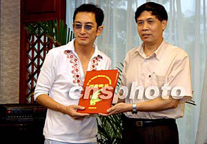 九月十三日,香港演藝界影視紅星吳啟華先生接受由廣州電視臺副臺長頒發的第十一屆“美在花城”準決賽評委聘書。作者:劉衛勇