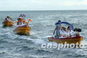九月十三日晚,2003年新絲路中國(guó)模特大賽在海南三亞的天涯海角的海灘舞臺(tái)上進(jìn)行最后的排練,這次決賽的參賽模特將從海上登陸演出舞臺(tái)。中新社記者:盛佳鵬