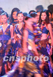 九月十三日晚,在2003年新絲路中國(guó)模特大賽海南三亞天涯海角的演出排練現(xiàn)場(chǎng),身著絢麗晚裝出場(chǎng)的模特成為舞臺(tái)上流動(dòng)的風(fēng)景。中新社記者:盛佳鵬
