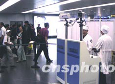 北京首都國際機場九月下旬重啟防非典監(jiān)察臺,醫(yī)護人員在乘客入口處的體溫自動監(jiān)測儀后值班,嚴防即將到來的黃金假期千千萬萬人流中發(fā)生疫情。中新社記者:賈國榮