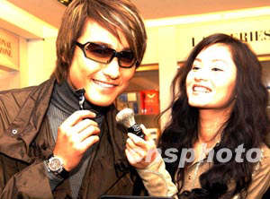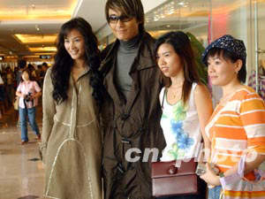 愛情偶像劇《真情告別》主角胡兵和瞿穎首次以“自由行”方式來港,以游客身份在尖沙咀商場購物,圖為游客與二人合影。中新社記者:錢興強