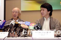 香港貿(mào)易發(fā)展局9月18日在香港舉行《香港國(guó)際影視展2003》記者會(huì),嘉禾娛樂事業(yè)主席兼貿(mào)發(fā)局影視娛樂業(yè)咨詢委員會(huì)主席鄒文懷(左)、「香港電影大使」成龍分別于會(huì)上發(fā)言。作者:鄧慶樂