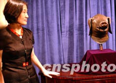 中華社會文化發展基金會,九月十八日在香港舉行“搶救流失海外文物”新聞發布會,中華社會文化發展基金會官員在會上向香港傳媒介紹流失海外文物《清.圓明園豬首銅像》。 中新社記者:錢興強