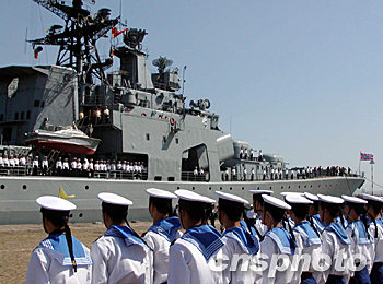 中國海軍北海艦隊某驅(qū)逐艦支隊“哈爾濱”號導(dǎo)彈驅(qū)逐艦執(zhí)行海上禮儀并陪訪。“哈爾濱”艦曾于1996年7月26日至8月2日,應(yīng)俄羅斯海軍邀請參加俄海軍建軍300周年慶;顒,當(dāng)時“潘捷列耶夫海軍上將”號大型反潛艦是“哈爾濱”艦的陪訪艦。(米晉國)