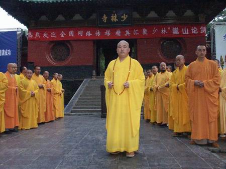 少林寺方丈釋永信在少林寺山門前主持盛大的歡迎儀式。釋永信在致歡迎詞時說:“嵩山論劍--中國互聯網新聞宣傳高峰論壇在少林寺召開,少林古剎古老的文明和現代科技將在這里碰撞與對接。