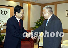 香港行政長官董建華(右)九月二十六日在辦公室會見到訪的河北省省長季允石,雙方就加強兩地的經貿合作交換意見。中新社圖