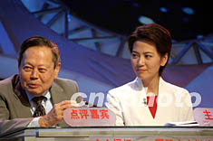 九月二十六日,2003年國際大專辯論會決賽在北京中央電視臺演播廳舉行,諾貝爾獎獲得者楊振寧(左)擔任辯論會的點評嘉賓。中新社記者:盛佳鵬