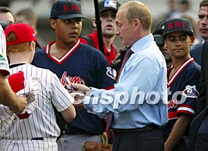 2003年9月26日,俄羅斯總統普京開始對美國進行正式訪問。在哥倫比亞大學,普京發表了演講,隨后,一同來訪的俄羅斯少年棒球隊與美國的一支少年棒球隊舉行了友誼賽。圖為賽前普京為雙方隊員簽名留念。Ic/cnsphoto 攝