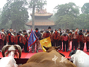 中新網曲阜9月28日電(記者 王魯平 毛公強)幽雅的古樂在空中回蕩,盛裝的少女在翩翩起舞,來自海內外的東方文化崇拜者及孔子的后裔,今天上午在孔子故里曲阜孔廟大成殿前隆重舉行莊嚴肅穆的儀式,紀念孔子誕辰兩千五百五十四年。
