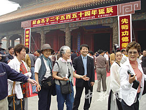 孔廟大成殿前懸掛著的“紀念孔子兩千五百五十四年誕辰”橫幅和“先師功德垂青史,儒學精華照五洲”的對聯,表達出海峽兩岸孔子后裔及海內外儒學信仰者的共同心愿。孔子第七十七代嫡孫孔德懋受在海峽彼岸臺灣的孔德成先生的委托,與家人一起來到大成殿前,祭拜祖先。眾多海內外孔子后裔與來自印尼、韓國、馬來西亞、美國、香港、臺灣、澳門等十多個國家和地區的祭孔參禮團的數百名來賓祭拜了“至圣先師”——孔子。