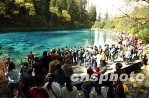 中國內(nèi)地“十一”黃金周開始,世界自然遺產(chǎn)、著名風(fēng)景區(qū)九寨溝迎來大批觀光客,風(fēng)景秀美的五彩池被游客團(tuán)團(tuán)包圍。中新社記者:毛建軍