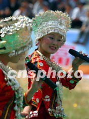 貴州省黔東南自治州苗族姑娘在國慶黃金周里以優美的傳統山歌迎接游客。這個民族的青年男女有以歌傳情、以舞達意的風俗。中新社記者:宋吉河
