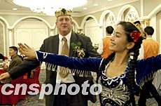 “十一”黃金周期間,外國游客在新疆烏魯木齊與維吾爾族姑娘載歌載舞,感受中國的少數民族風情。中新社記者:張宇