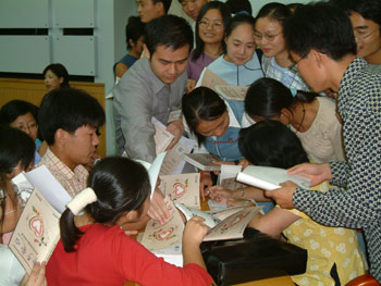 華夏愛心團愛心專員、著名畫家李繁民向合工大的愛心志愿者組織贈送了現場即做的巨畫“鵬程萬里”圖。演講結束后,太陽星城愛心之旅采訪團向合工大贈送了來自民間的思悟錄——〈牽手愛心〉,大學生們將周永琴、趙玉芝、宋體金、李繁民團團圍住,請他們簽字留念。