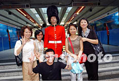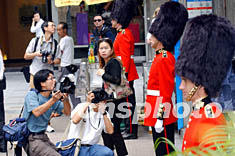 在國慶黃金周之際來香港 “自由行”的內地游客,10月6日在中環鬧市巧遇國泰航空推廣活動,紛紛把握機會與英國衛兵合影,顯得興高采烈。作者:統計員