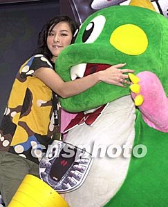 歌星李蘢怡10月7日在香港出席諾基亞N-Gage手提游戲機推廣活動,擁抱可愛的卡通人物“泡泡龍”。作者:鄧慶樂