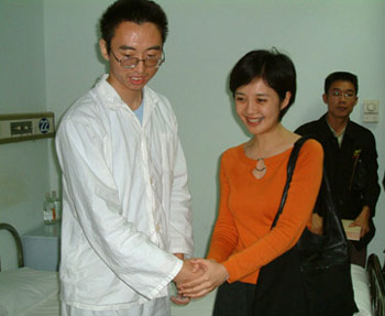 9月26日下午,帶病堅持工作的鳳凰衛視知名女主播、“華夏愛心團愛心專員”許戈輝,手捧鮮花,來到空總血液科病房慰問干海濤,并現場捐贈了一萬元,表達自己的愛心,祝愿海濤早日康復。北京太陽宮房地產有限公司總經理韓國建也代表華夏愛心團捐助了現款,并邀請海濤在“牽手愛心墻”的采集印上按下了自己的手印。