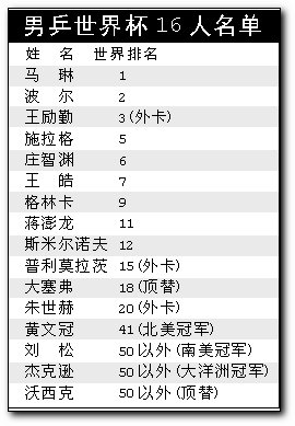 盡管薩姆索諾夫因故放棄參賽,孔令輝也由于排名限制而無緣與會,然而參賽的十六名選手已可代表當今男子乒壇的最高水平。