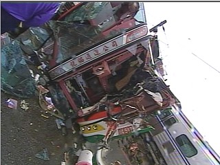 中新網10月14日電 臺北縣鶯歌鎮今日上午7點38分,發生重大車禍,在東鶯路平交道,游覽車疑似闖平交道,當場被南下電聯車撞上,造成4死27人受傷。