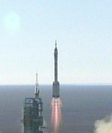 中國第一艘載人飛船“神舟”五號從載人航天發(fā)射場發(fā)射升空。(電視截圖)