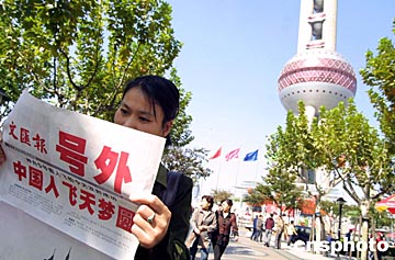 十五日上午,中國自行研制的“神舟”五號載人飛船,在酒泉衛星發射中心發射成功,這一歷史性時刻受到中國億萬人民的關注。圖為上海市民關注發射成功的新聞報道。作者:湯彥俊