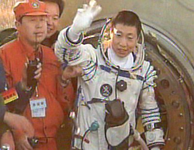 中國首位航天員楊利偉乘坐的“神舟”五號載人飛船,于北京時間十月十五日九時,在酒泉衛星發射中心用“長征二號F”型運載火箭發射升空。