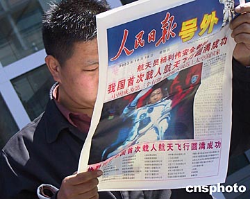 相關報道:香港輿論聚焦“神舟”五號征空成功市民紛紛搶閱 (2003-10-16 15:02:58)