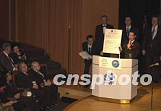 17日晚在日本東京閉幕的第十八屆世界宇航員會議發(fā)表了一項由與會六十六名宇航員署名的共同宣言,呼吁世界各國以各自的成熟文化為今后的宇宙探險做出貢獻(xiàn)。圖為本屆大會主席之一的日本資深宇航員毛利衛(wèi)在閉幕式上展示這份共同宣言。作者:王健