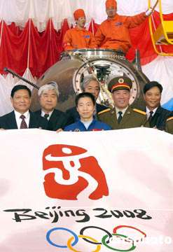 中午十二時,當北京奧組委主席劉淇從中國航天科技集團公司總經理張慶偉手中接過這面不尋常的旗幟時,全場報以熱烈掌聲。今年八月底,中國航天科技集團公司向北京奧組委發函,商請在“神舟”五號上搭載二00八年奧運會會徽旗幟。這個建議得到了積極而迅速的響應。九月中旬,一面精心制作的印有“中國印·舞動的北京”圖案的大幅白色會旗正式交付中國航天科技集團公司。十月十五日九時,這面旗幟搭乘“神舟”五號踏上了遨游太空的旅程,并于十六日六時二十三分安全返回地面。
