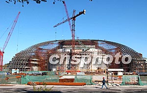 金秋十月,號(hào)稱“中國(guó)第一藝術(shù)殿堂”的國(guó)家大劇院工程建設(shè)進(jìn)展順利,跨度達(dá)二百一十二米的巨大穹形屋頂鋼結(jié)構(gòu)骨架已開始安裝,國(guó)家大劇院蛋形輪廓初步顯現(xiàn)。中新社記者:張煒
