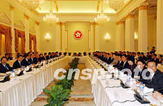 十月二十七日,滬港經(jīng)貿(mào)合作會(huì)議在香港禮賓府舉行,圖為香港特別行政區(qū)行政長(zhǎng)官董建華、財(cái)政司司長(zhǎng)唐英年、律政司司長(zhǎng)梁愛詩(shī)出席該會(huì)議。中新社記者:潘索菲