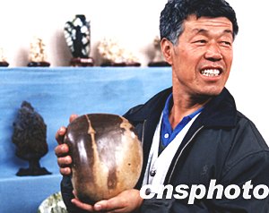 山西省垣曲有一位奇石收藏愛好著,不久前他在黃河小浪底水庫中發現了一顆圓石頭,石頭上有一個和“神州五號”載人火箭升空時的情景異常相似。2003年10月下旬,他為慶祝“神州五號”的發射成功,特將這塊奇石拿出來進行展覽。張旦 攝