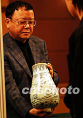 中國嘉德2003秋季拍賣會將于十一月舉行,十月三十日,眾多將拍賣的文物珍品開始在北京進行預展,著名影視演員王剛到現場探察拍賣品情況并對一款明清時代的青花瓷瓶仔細鑒賞。中新社記者:王麗南