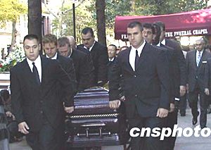 三十日上午十點左右,宋美齡的靈柩從曼哈頓法蘭克坎貝爾殯儀館運出,移至紐約上州的芬克里夫墓園,包括孔令儀夫婦在內的眾多親友一起陪護在旁,并隨靈車一起前往墓園。中新社記者:趙海燕