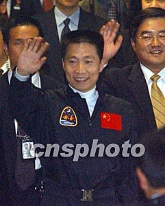 中國首位航天員楊利偉與載人航天代表團一起十月三十一日由北京乘專機抵達香港國際機場,受到香港各界人士熱烈歡迎。中新社記者:錢興強