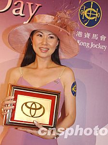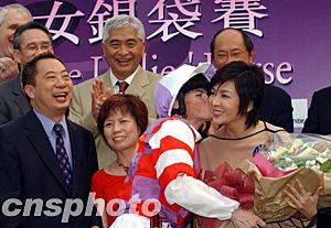 香港婦女銀袋賽十一月二日在沙田馬場舉行,獲得該賽頭馬的騎師親吻影星關之琳。中新社記者:潘索菲