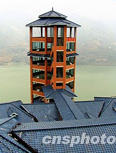 重慶市奉節縣移民新城在整體建設上重視繼承和發揚民族文化建筑傳統,并于近期在該縣魚腹試驗區修建了一批古建筑群,集中再現當地獨具特色的民俗文化。圖為已竣工的夔門大酒店“攬月樓”,造型別致,具有土家山寨風格之韻。作者:周會