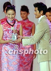 “2003中華小姐環球大賽”總決賽11月8日晚在香港會展中心舉行,圖為香港歌星郭富城為獲得最佳上鏡獎的天津選手劉若菲頒獎。中新社記者:錢興強