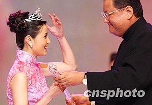 “2003中華小姐環球大賽”總決賽11月8日晚在香港會展中心舉行,經角逐來自上海的參賽選手江欣榮獲中華小姐大賽冠軍。中新社記者:錢興強